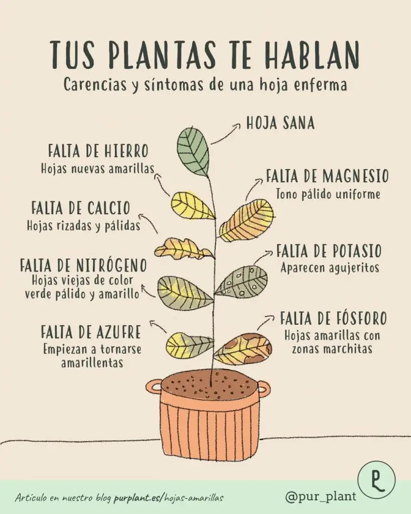 - Deficiencias nutricionales: La falta de ciertos nutrientes esenciales como el nitrógeno, hierro y magnesio puede causar hojas amarillas. Cada deficiencia tiene su propio patrón de amarillamiento, lo que puede ayudarte a identificar cuál es el problema.